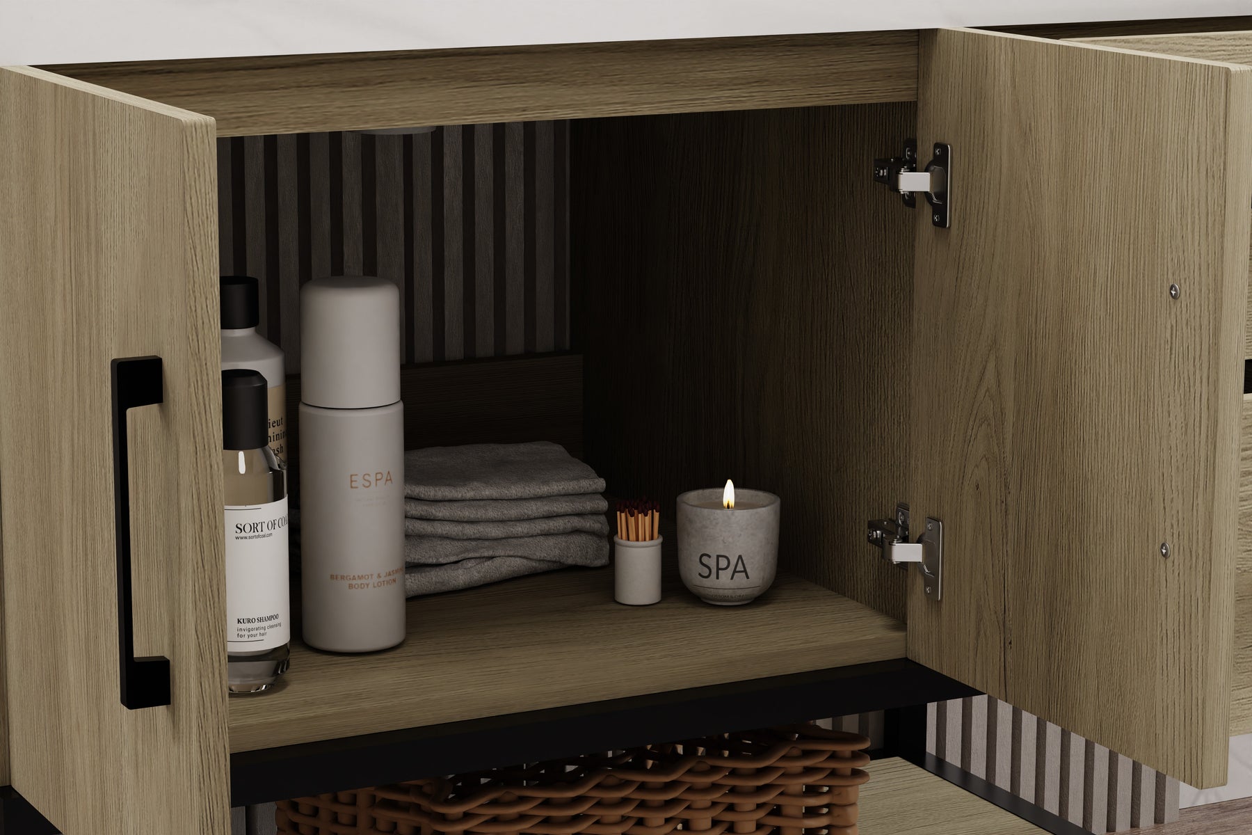 • Storage: 2 soft-closing drawers + 2 soft-closing doors + 1 open metal shelf