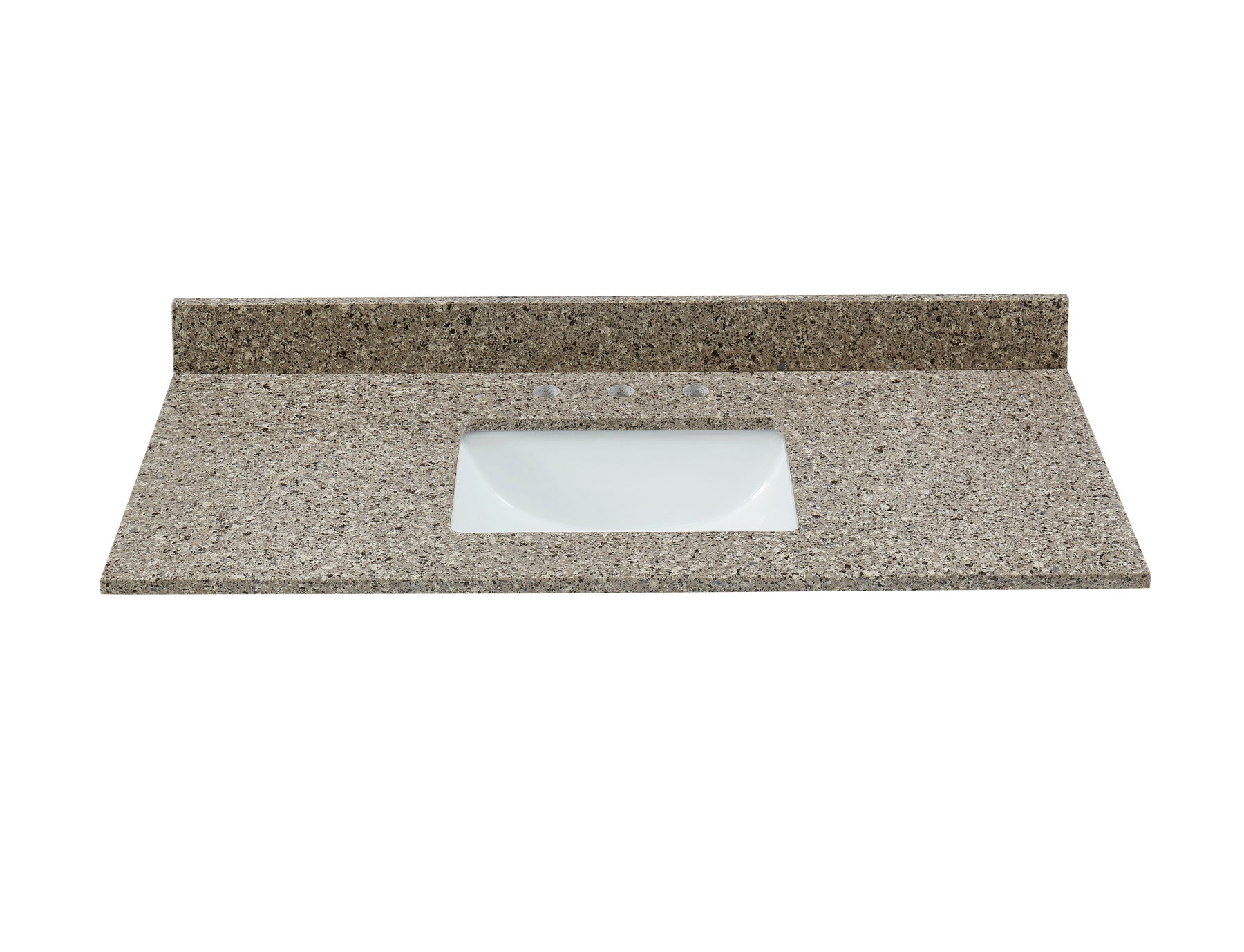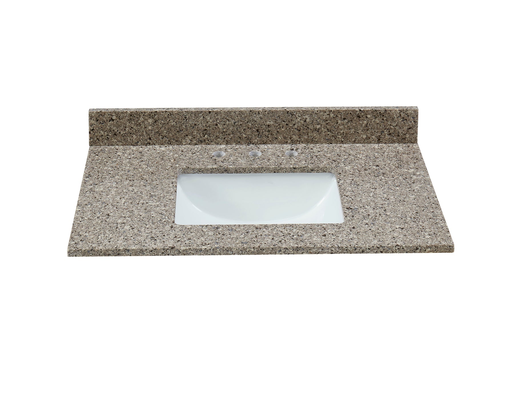 An undermount rectangular porcelain sink is included, seamlessly integrated into the countertop. A matching side splash is available for separate purchase to complete the installation.