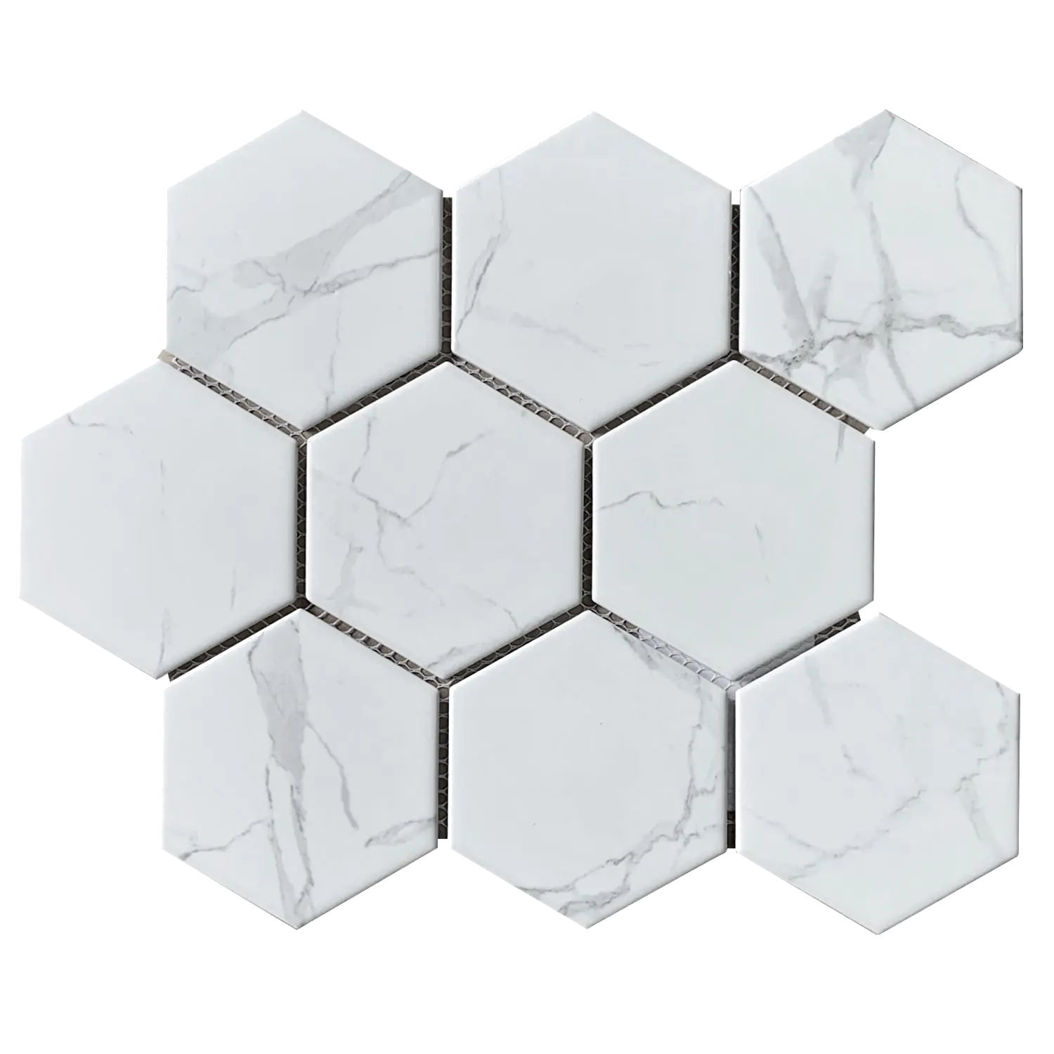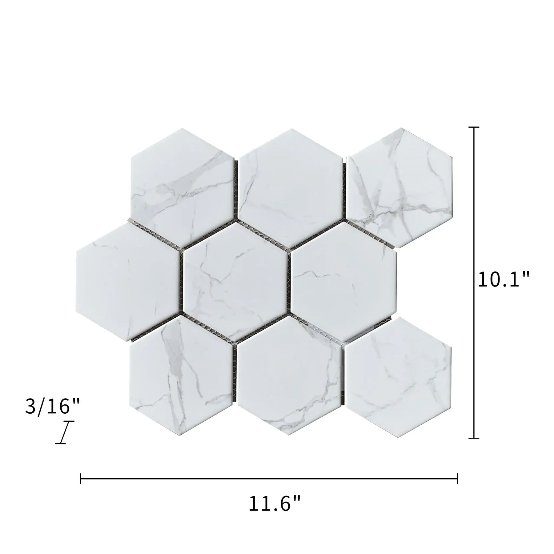 4-inch Hexagon Statuario Satin Porcelain Mosaic Tile – single 12x10 inch glazed tile for modern floor and wall applications.