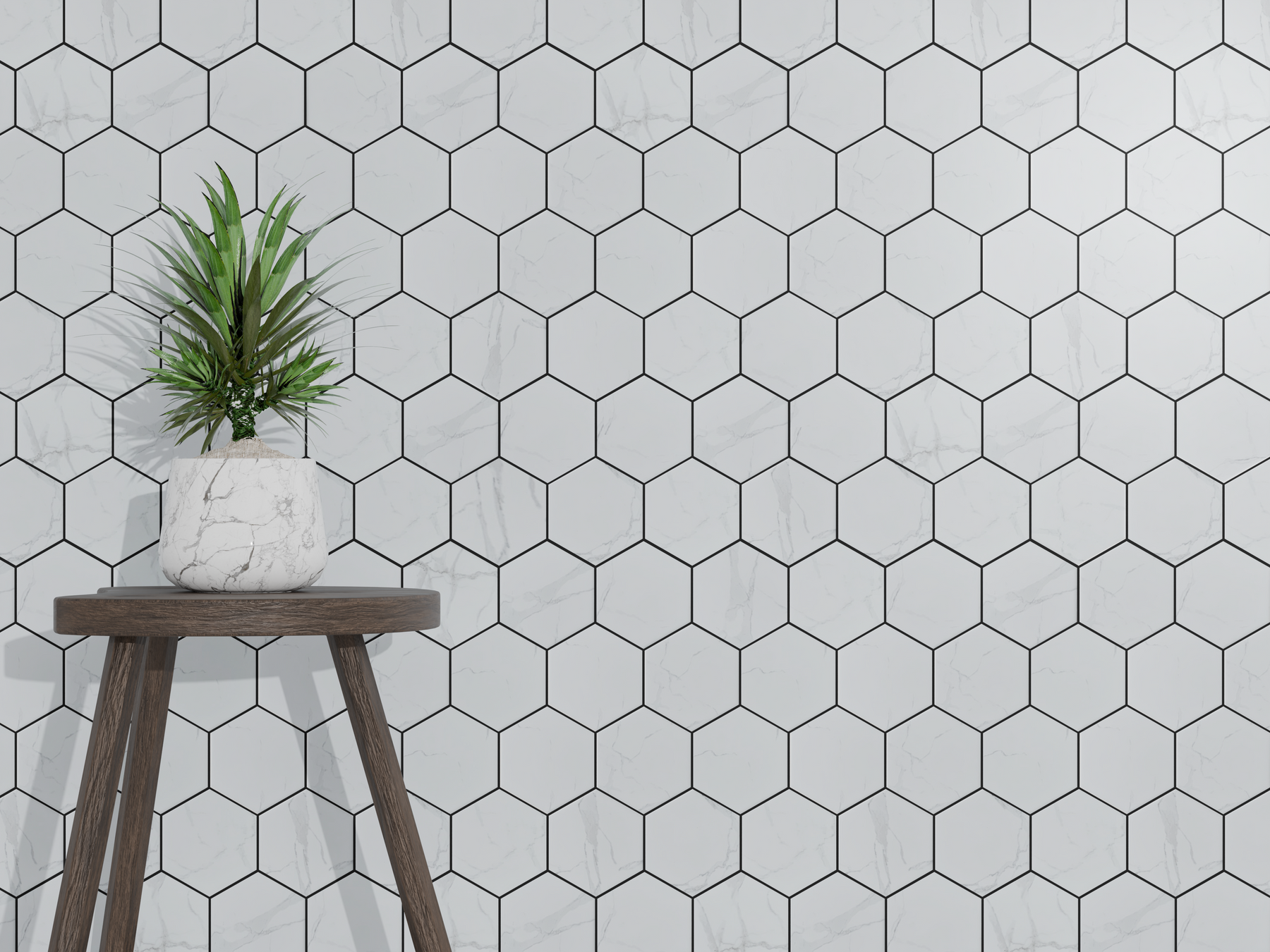 Display board of 4-in Hexagon Statuario Satin Porcelain Mosaic Tiles – satin glazed tiles arranged for showroom presentation.