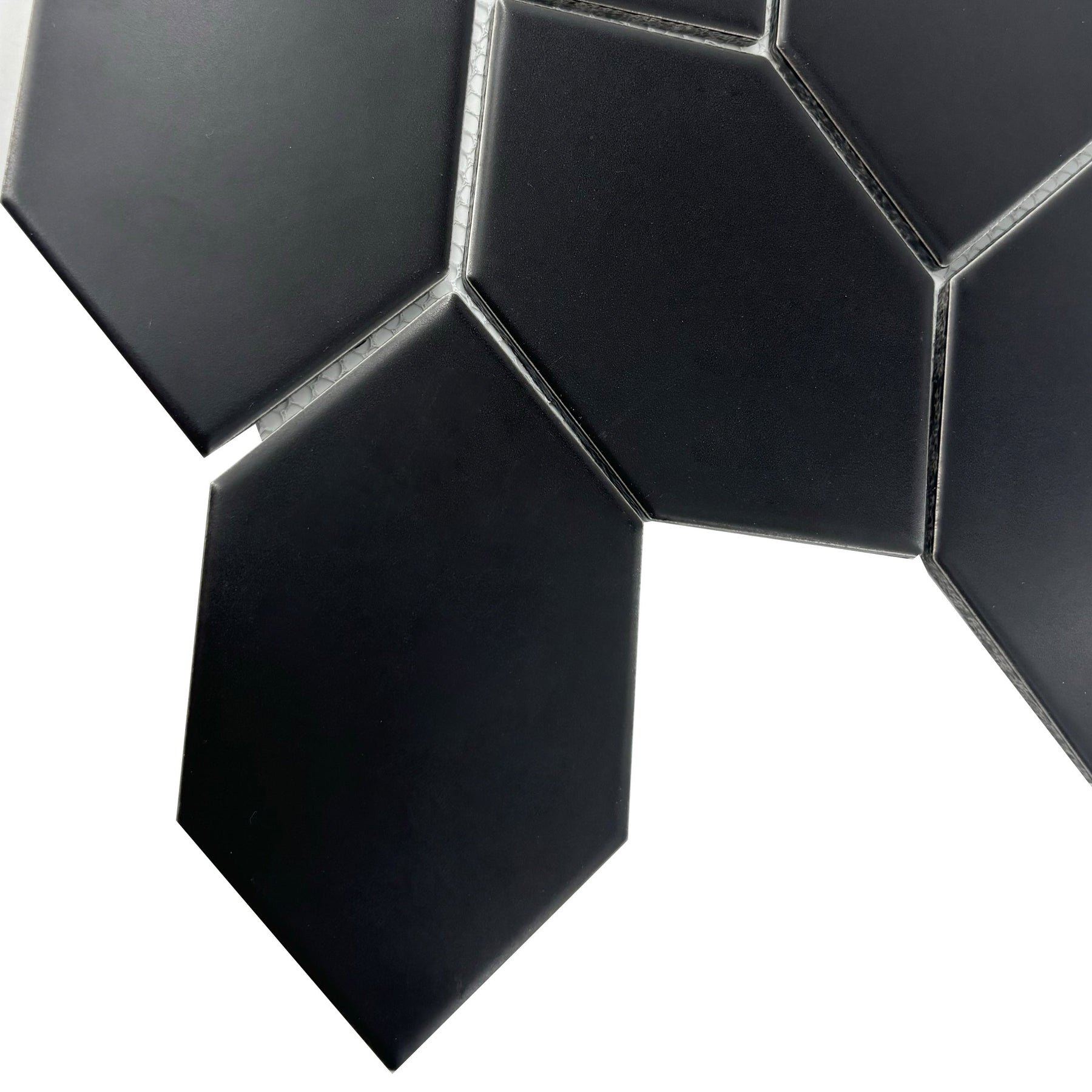 Add a touch of sophistication and contemporary flair to your space with our Black Porcelain Mosaic Stretched Hexagon Leaf Pattern. This unique mosaic combines the sleekness of black porcelain with an intricate stretched hexagon leaf design, creating a striking visual appeal. The glossy finish enhances the deep black tones, while the leaf pattern adds a natural, organic texture that brings both elegance and warmth to any room.