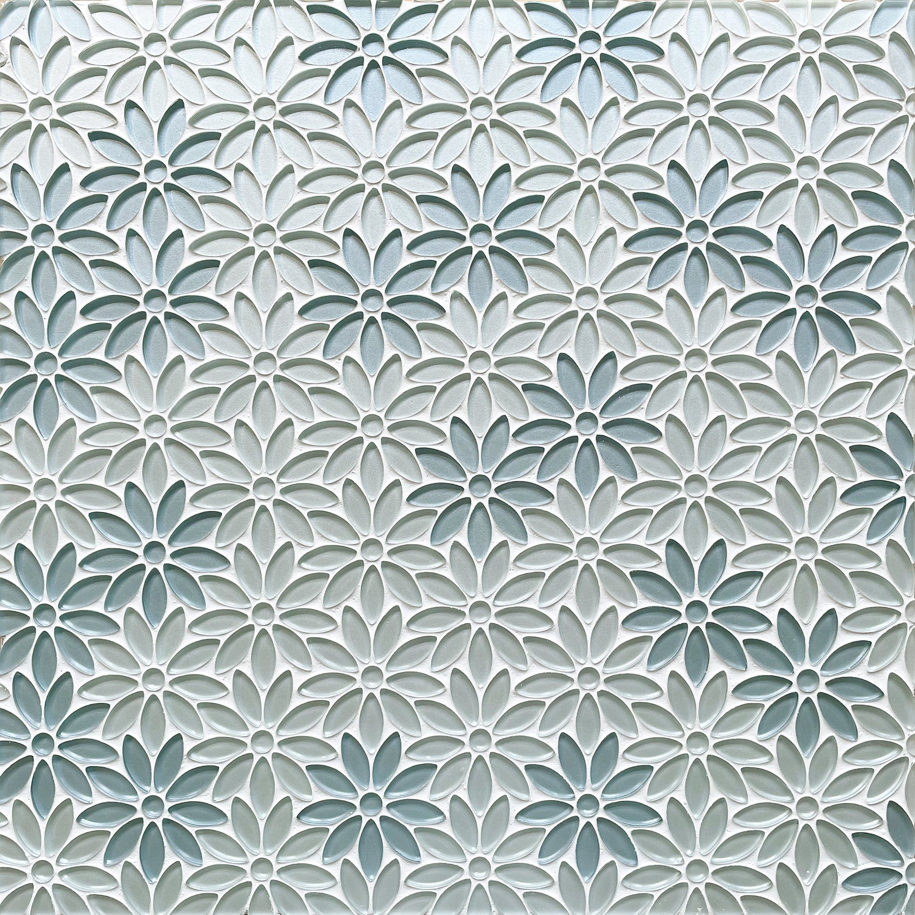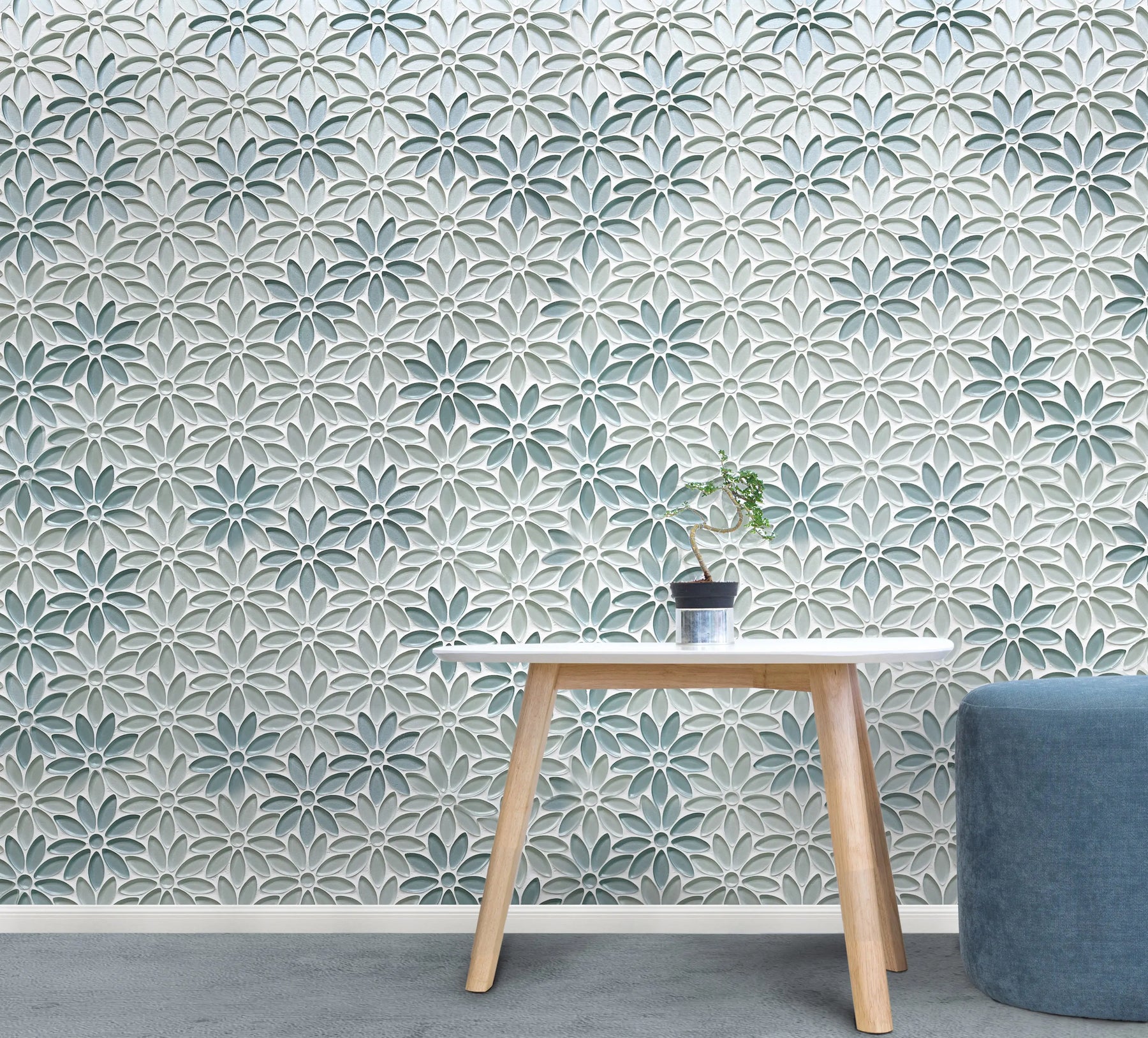 Interior space featuring 9x11 inch Blue and Taupe Glass Mosaic Wall Tile – modern floral wall accent