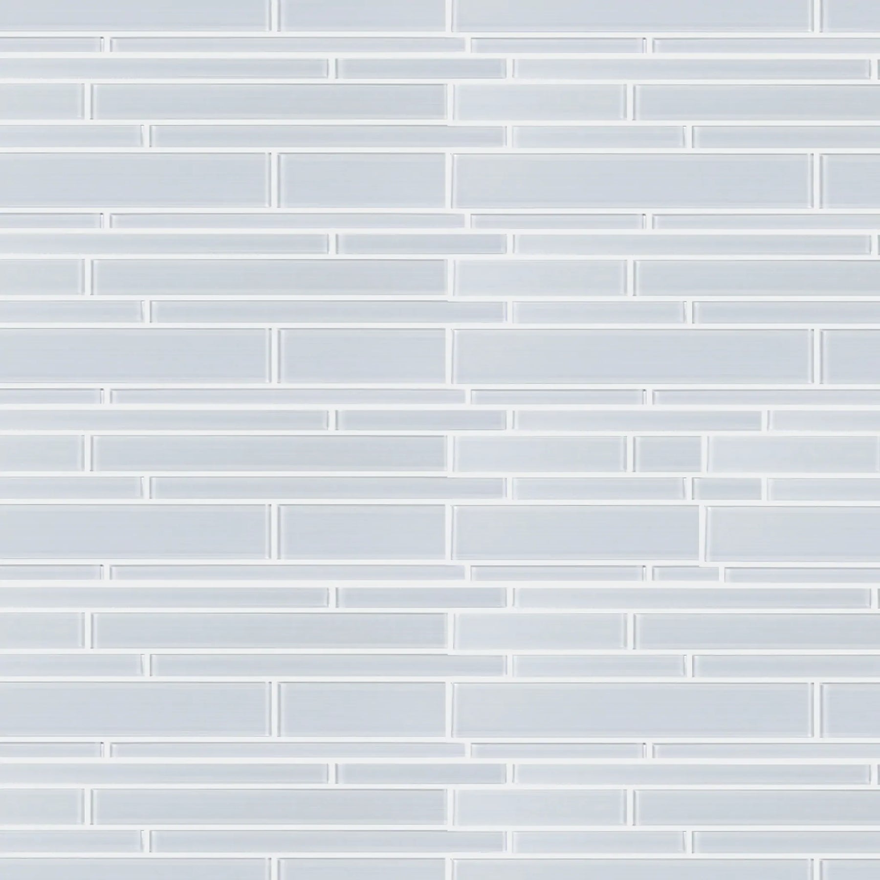 Single 6x18 inch Ice Glass Mix Random Strip Decorative Mosaic Wall Tile – clear and frosted glass strips in an icy blend, 0.75 sq. ft per piece.