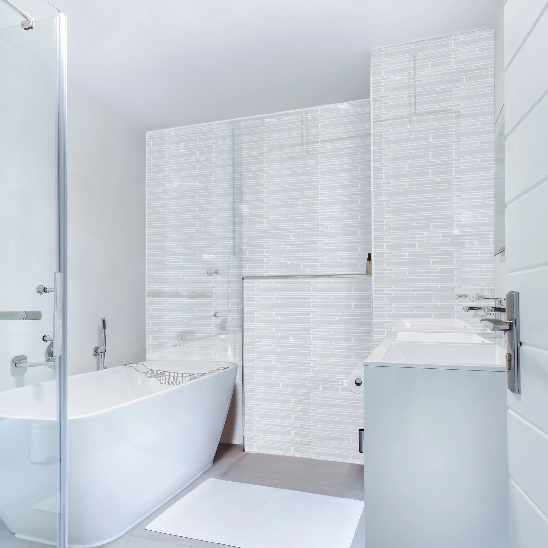 Bathroom wall tiled with Ice Glass Mix Random Strip Decorative Mosaic Tiles – frosted and clear glass creating a serene atmosphere.