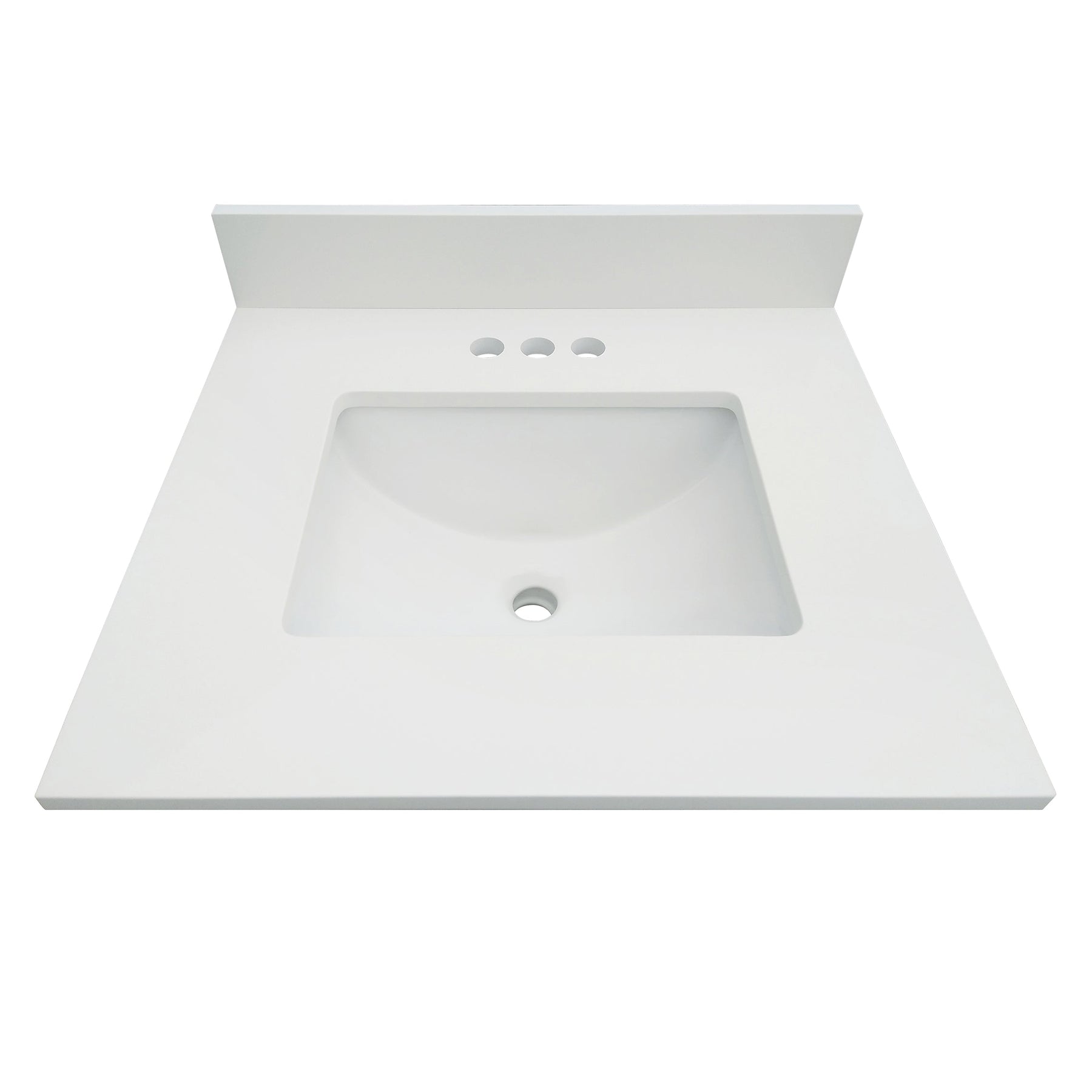 Crafted from premium engineered quartz, the non-porous surface is stain-, scratch-, moisture-, and bacteria-resistant, ensuring years of beauty with minimal maintenance. The eased edge profile and 4" high backsplash add a refined touch, while the included rectangular undermount sink offers clean lines and practicality.