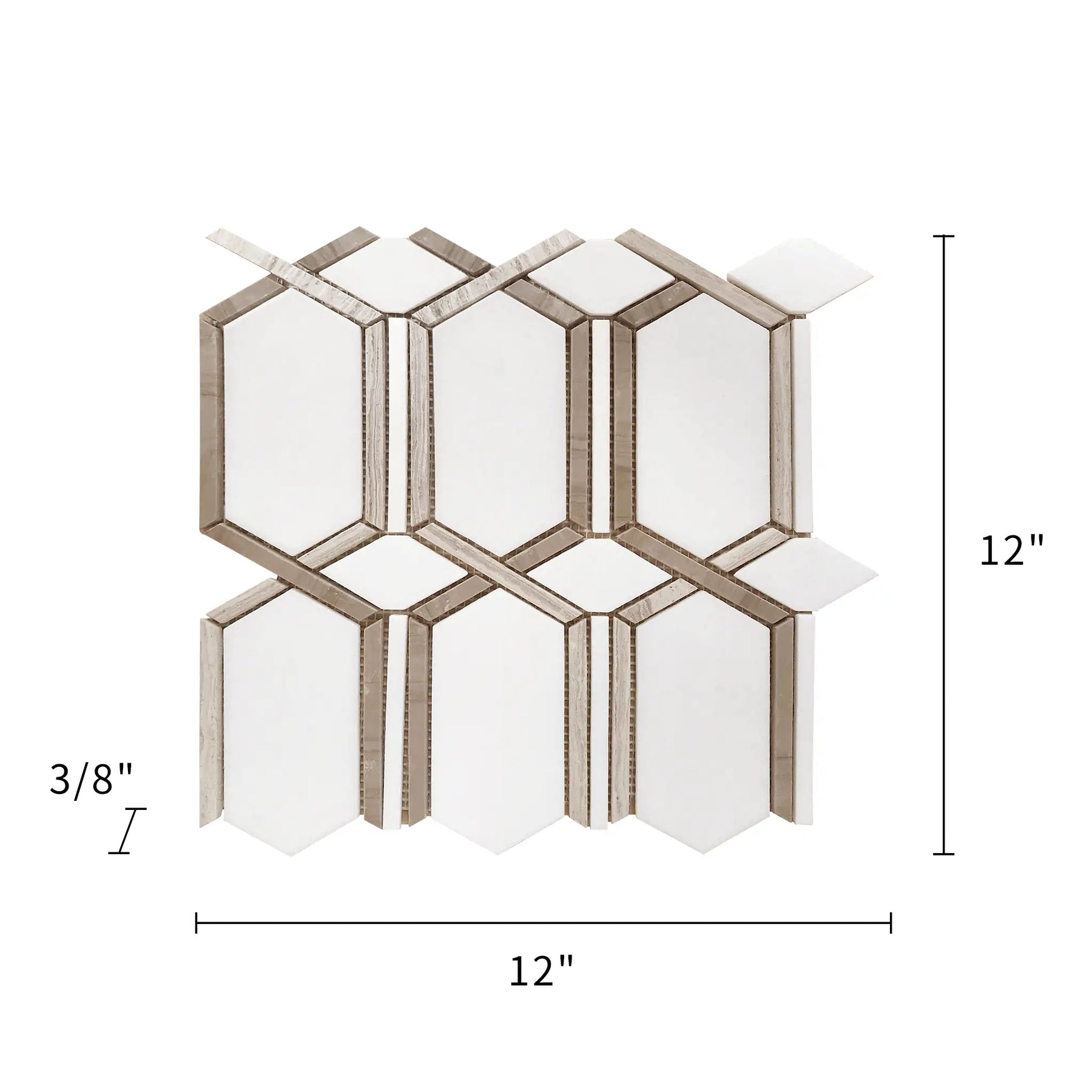 Create a stunning and lasting impression with the Wooden White with Athens Gray and Thassos Marble Geometric Mosaic, a perfect blend of natural elegance and modern design for your home.