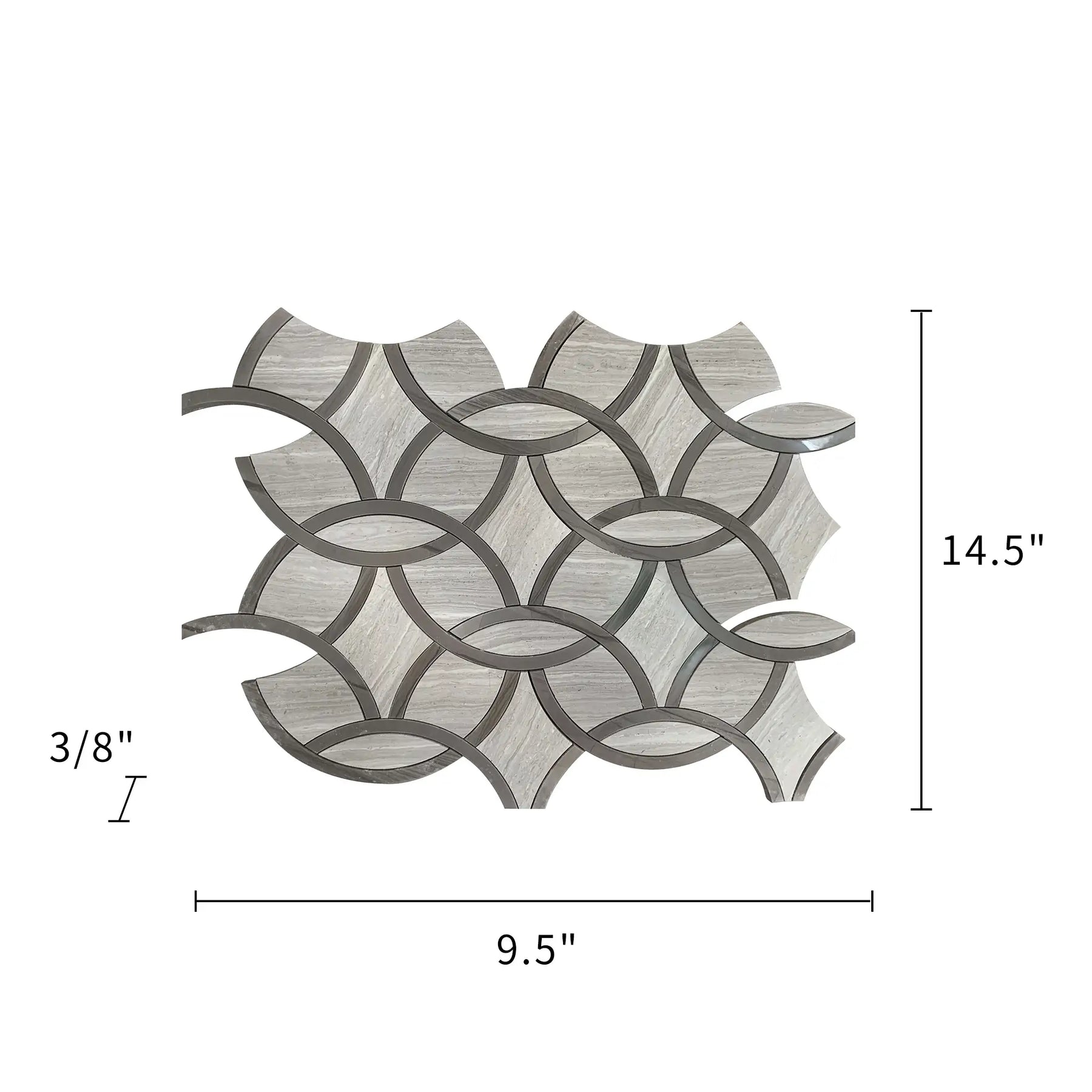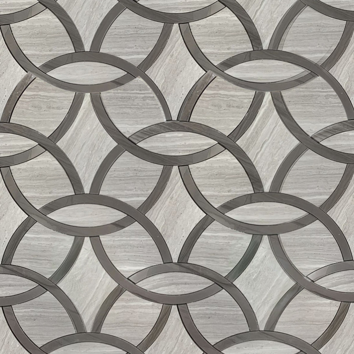 Ideal for both residential and commercial applications, the WW & Athens Gray Interlocking Circles Polished Waterjet Mosaic Tile is a perfect fusion of luxury, durability, and modern elegance, making it a standout feature in any design.