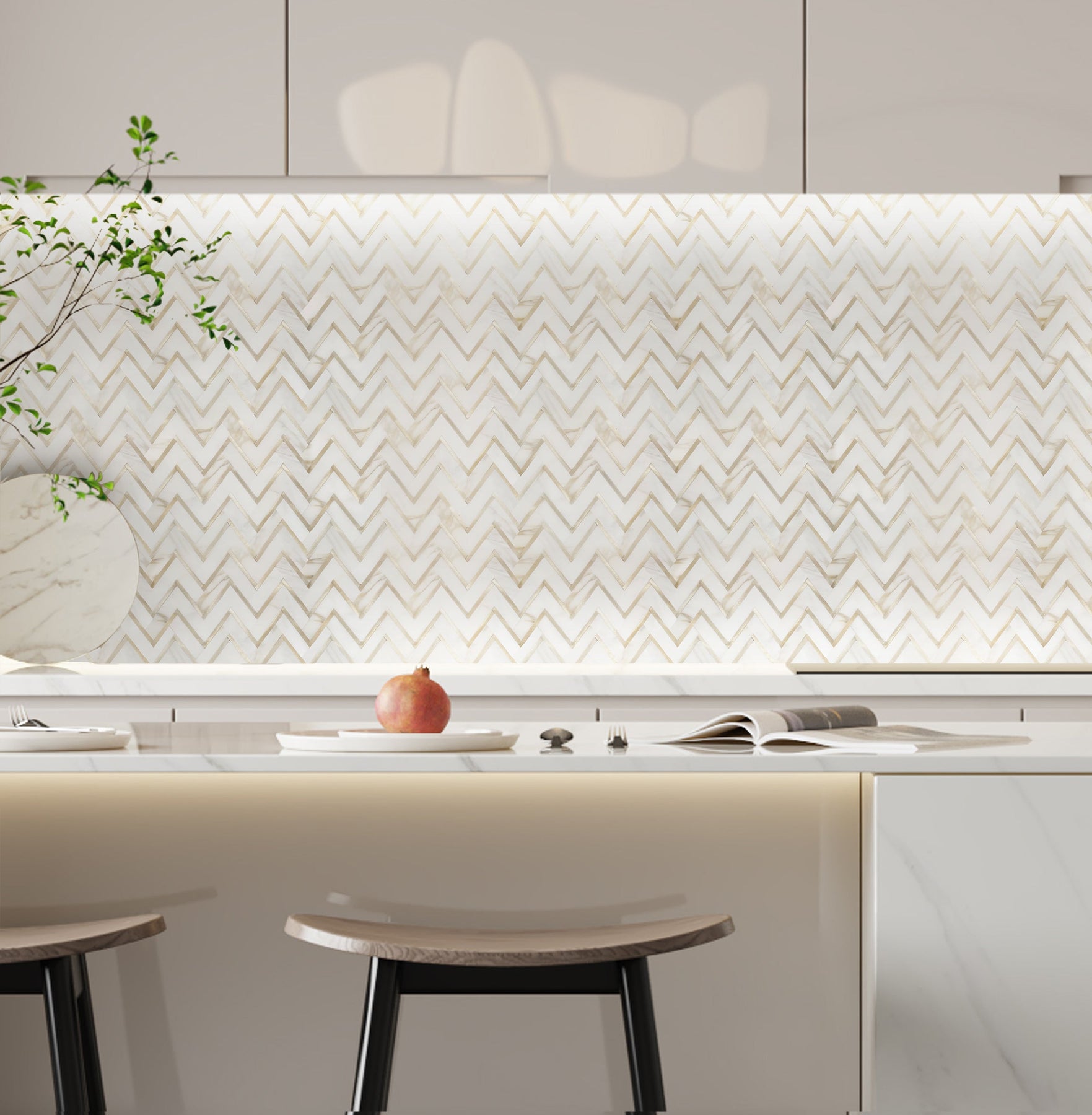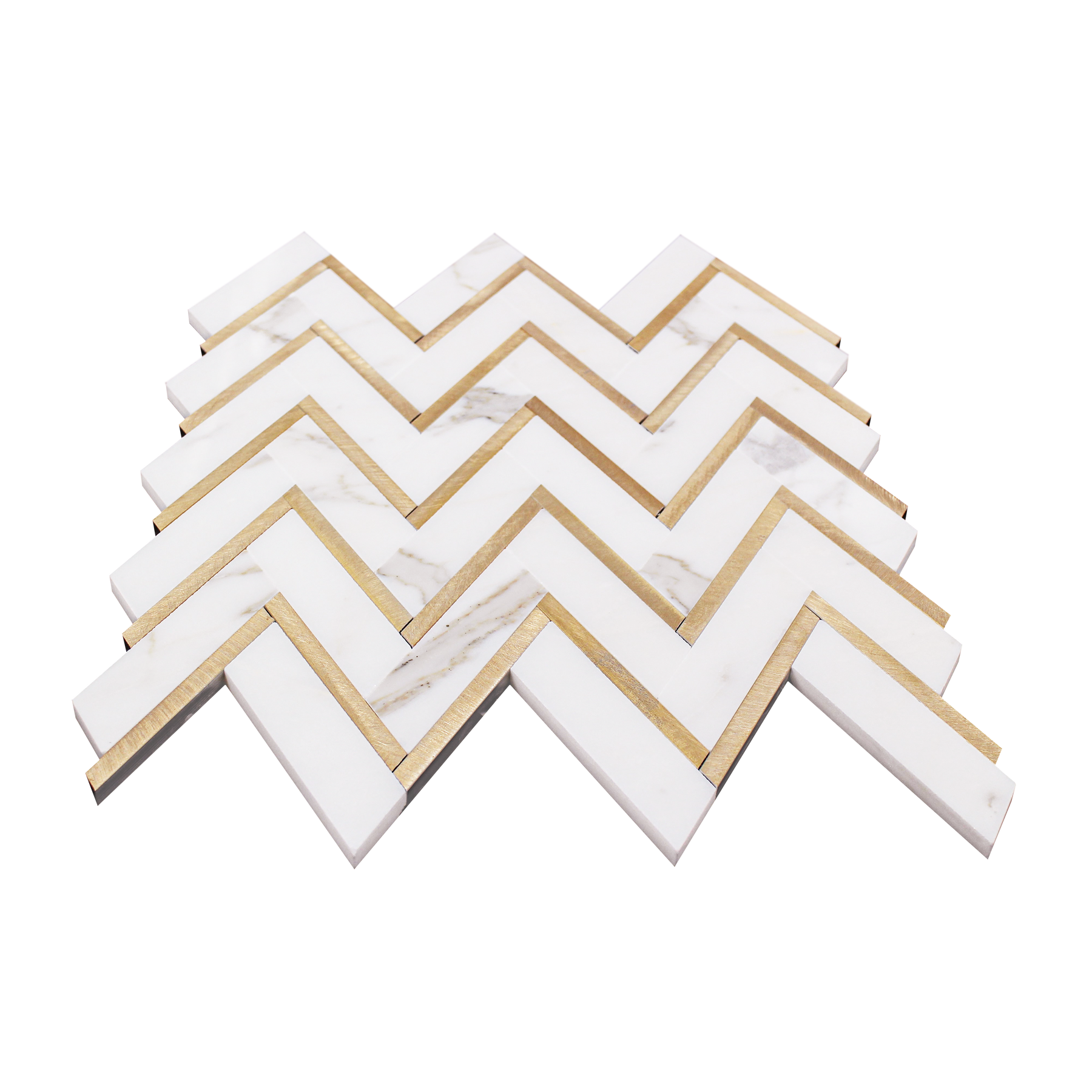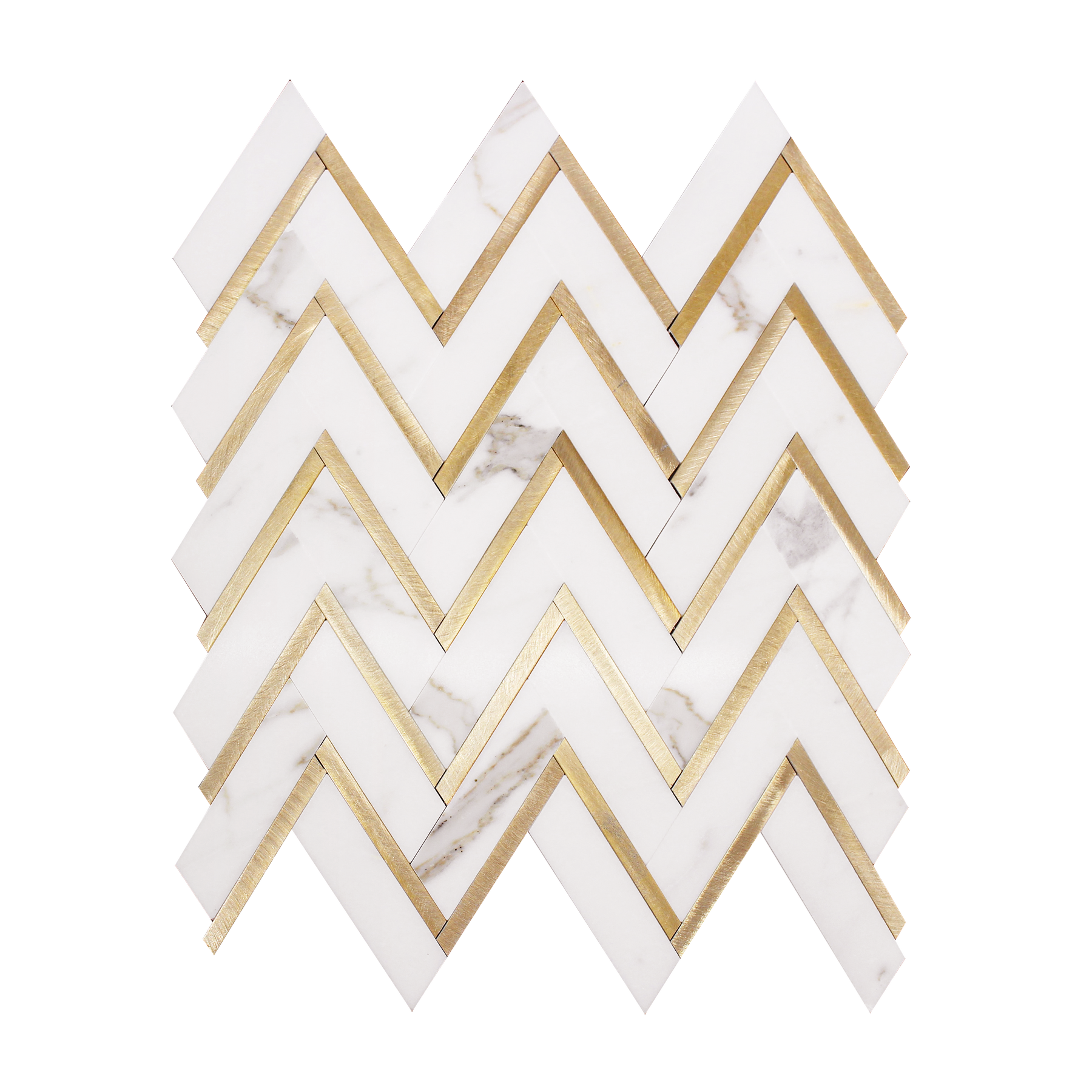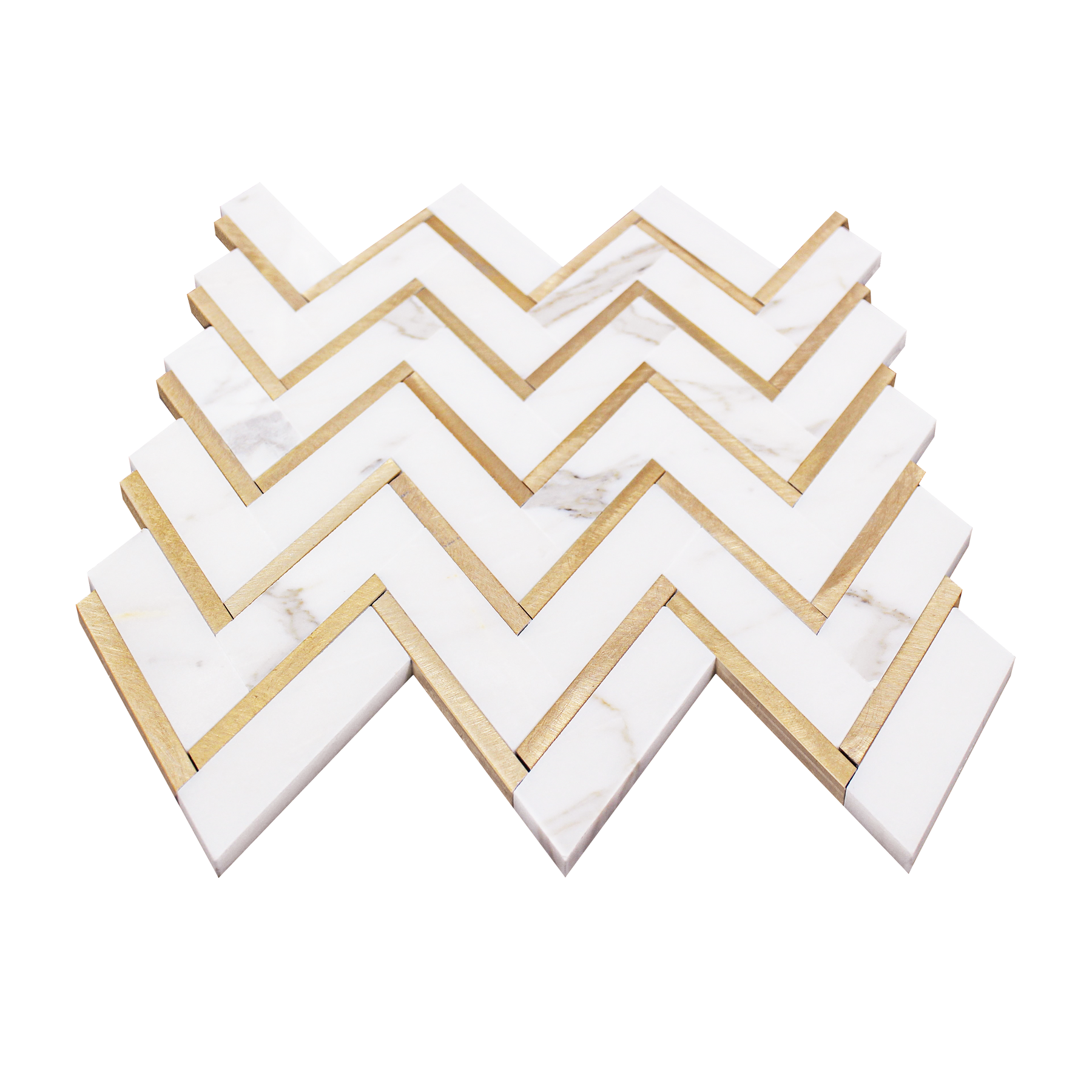 Elevate your space with the sophisticated beauty of our Zigzag Calacatta White with Gold Metal Mosaic. This luxurious tile features the timeless elegance of Calacatta white marble with bold, modern zigzag patterns accented by gold metal strips, creating a striking contrast that’s perfect for contemporary interiors. The refined combination of smooth marble and metallic detail adds both texture and depth to any wall or floor.